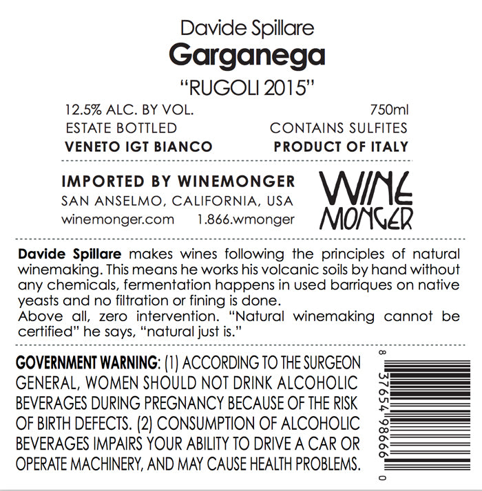The Rugoli is Davide Spillare's bottling of his 80 year old Garganega vines grown on a ancient pergola system in volcanic soils. It is farmed biodynamically, fermented with native yeast and aged in used oak. There is no fining, filtering or use of any sulphur additions for any of his wines.