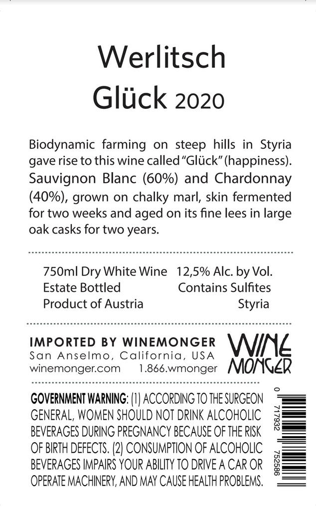 Biodynamic farming on the steep hills in Styria. Gluck means happiness and is a cuvee of Morillon (Chardonnay) and Sauvignon Blanc. Minimalist winemaking as always. Skin fermented for 2 weeks and aged on its fine lees in large oak casks for 2 years. Unfined. Unfiltered. Min SO2.. There are two skin-contact wines from Werlitsch in clay bottles: Glück & Freude.