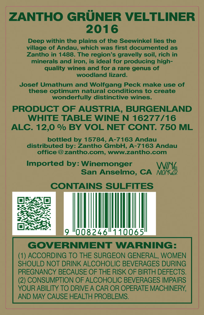 Grown on gravelly dry soils in a warm windy microclimate it is fermented and aged entirely in stainless steel tank preserving its pure, clean character. Zippy stone fruits, minerality. Zantho is a collaboration of famed winemaker Josef Umathum of Weingut Umathum and Wolfgang Peck of Winzerkeller Andau. They work with long standing contracts that showcase the distinct climate of the Neusiedlersee-Seewinkel region of Burgenland. Lake Neusiedl is a large very shallow lake, bird sanctuary and a UNESCO World Heritage site that straddles Austria and Hungary. While Burgenland is known for being a wonderful site for ripening traditional red varieties, it also is home to gorgeous Gruner Veltliners and a swath of other refreshing white wines. While these are contracted sites, evidence of their commitment to sustainability are many: wind turbine power utilizing the constant winds from the east, electric vehicles and charging stations onsite further promote clean energy. The results of their efforts are wines of extraordinary value and finesse.