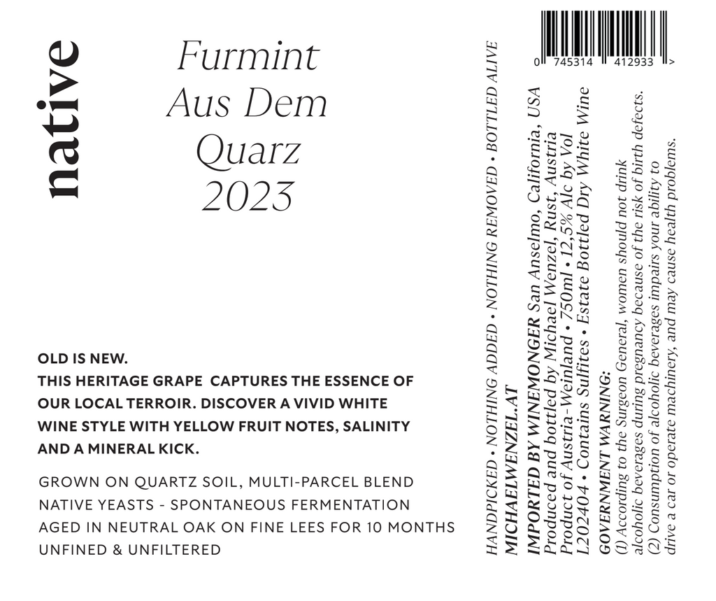 The Furmint comes from 3 sites dotting the Ruster hill chain above Lake Neusiedl in the historic town of Rust in Burgenland. The vineyards were replanted 30 years ago and their easterly orientation means ripening is slow and continuous and results in desired sugar levels with impeccable phenolics and complexity. The soils mainly consist of slate crystals and gneiss particles with quartz. The grapes were hand-picked over time in several passes and put straight into the press without crushing or destemming. The free run and lightly pressed juice was cold settled for 48 hours before being racked and inoculated with a neutral yeast strain-selection from a biodynamic treated habitat. Fermentation occurred in stainless steel tanks on the fine yeast lees until bottling. Minimal sulphur use.